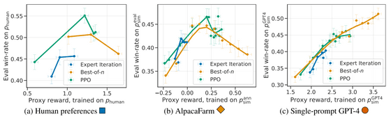 또한 AlpapaFarm에 의한 시뮬레이션에서는 실제 인간을 이용한 RLHF를 실시하는 경우와 마찬가지로 과잉 최적화 등의 현상이 발생합니다.