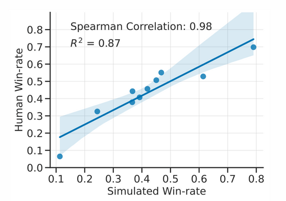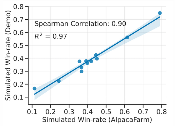 모델의 응답 평가 시 인간과 AlpacaFarm의 일치율은 아래 그림과 같습니다. 아래 그림은 기준이 되는 모델보다 평가 대상 모델의 응답이 뛰어나다고 판정되는 비율을 플롯 한 것으로, 이 그림을 보면 인간의 평가가 낮으면 AlpacaFarm의 시뮬레이션 평가도 낮아지고, 반대로 인간이 높이 평가한 모델은 AlpacaFarm도 높이 평가하고 있습니다. 실제 인간에게 평가받는 것에 비해 45분의 1의 비용으로, 매우 짧은 시간만에 동등한 평가를 얻을 수 있었습니다.