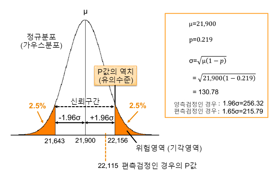 또한 임계치 판정은 양측 검정과 단측 검정이 있습니다. 만약 반드시 값이 크다는 것이 자명한 경우에 P 값을 0.05로 한 경우, 큰 쪽에만 5%가 위험영역이 됩니다. 만약 동일하게 0.05로 단측을 하면 P 값의 한계는 22,115명이 되므로 22,150명이 위험 영역에 들어가게 되는 것입니다.