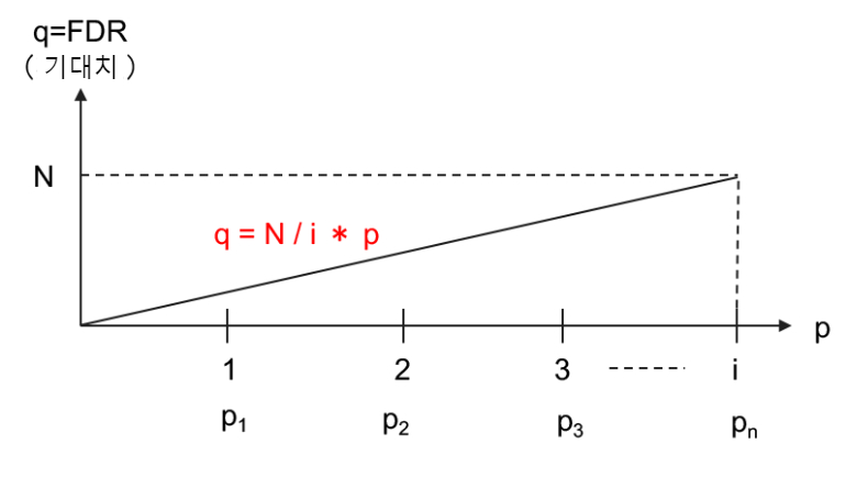 이 q가 FDR의 기대치입니다. p 값을 오름차순으로 정렬했을 때 q 값이 어떤 값이 될지를 그림 3과 같은 관계식으로 구하고 있습니다.