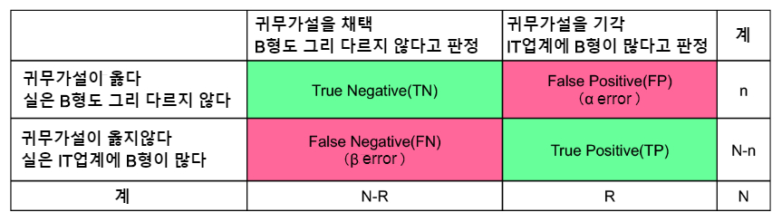 유의 수준을 초과하지 않은 경우, 대립 가설은 부정당합니다. 한편, 우위 수준을 초과하는 경우는 대립 가설을 옳다고 판정하는 것이 아니라, "부정할 수 없다"는 관공서 같은 답변입니다. 하지만 유의 수준을 초과하지 않은 경우에도, 사실은 IT업계에 B형이 많은데도 B형의 비율은 그렇게 다르지 않다고 판정해 버리는 Fales Negative(FN)가 생길 가능성이 있습니다.