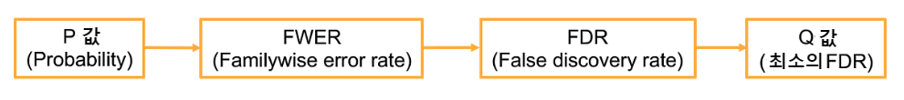 이 문제를 해결하기 위해 다중성에 따라서 어느 정도는 틀려도 좋다는 발상에서 등장한 것이 FDR(false discovery rate)입니다.