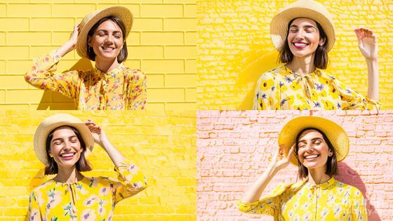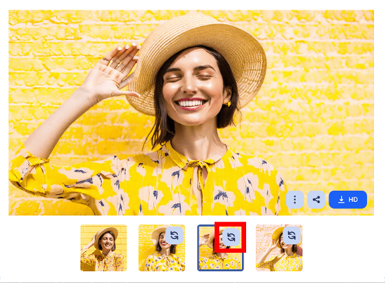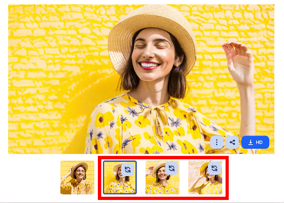 그리고, 생성된 3장의 유사 이미지가 아래. 「눈을 감고 있다」, 「치아를 드러내고 웃고 있다」, 「밀짚모자와 노란 옷을 착용하고 있다」라는 특징을 유지한 채 이미지를 생성할 수 있었습니다.