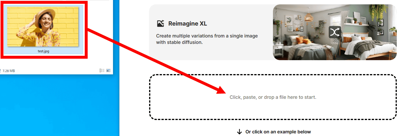 Reimagine XL의 사용법은 매우 간단합니다. 유사한 이미지를 생성하려는 이미지를 점선으로 둘러싸인 영역으로 드래그 앤 드롭하면 됩니다.