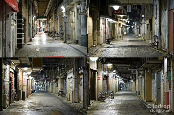 「폐점 후의 점포가 늘어선 상가」의 분위기의 유사 이미지를 생성할 수 있었습니다.