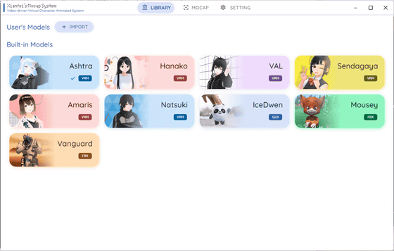 그러면 SysMocap 창이 시작됩니다. SysMocap이 지원하는 3D 아바타의 파일 형식은 VRM 형식, GLB 형식, FBX 형식으로 자신의 파일을 읽을 수 있으며, 기본적으로 9 종류의 아바타가 수록되어 있습니다.