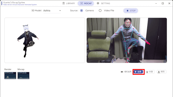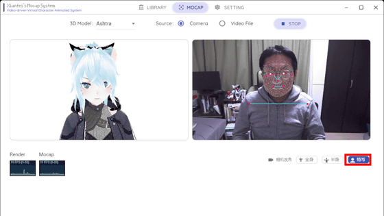 다음으로, 상단의 「MOCAP」를 선택, 3D Model에서 3D 아바타를 선택하고 Source에서 Camera를 선택한 다음 START를 클릭합니다.