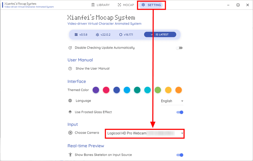 상단에서 "SETTING"을 선택하고 "Input"에서 카메라를 선택합니다.