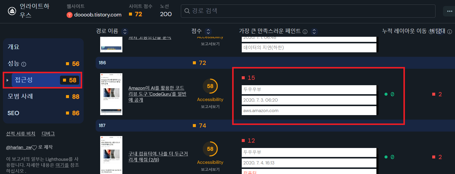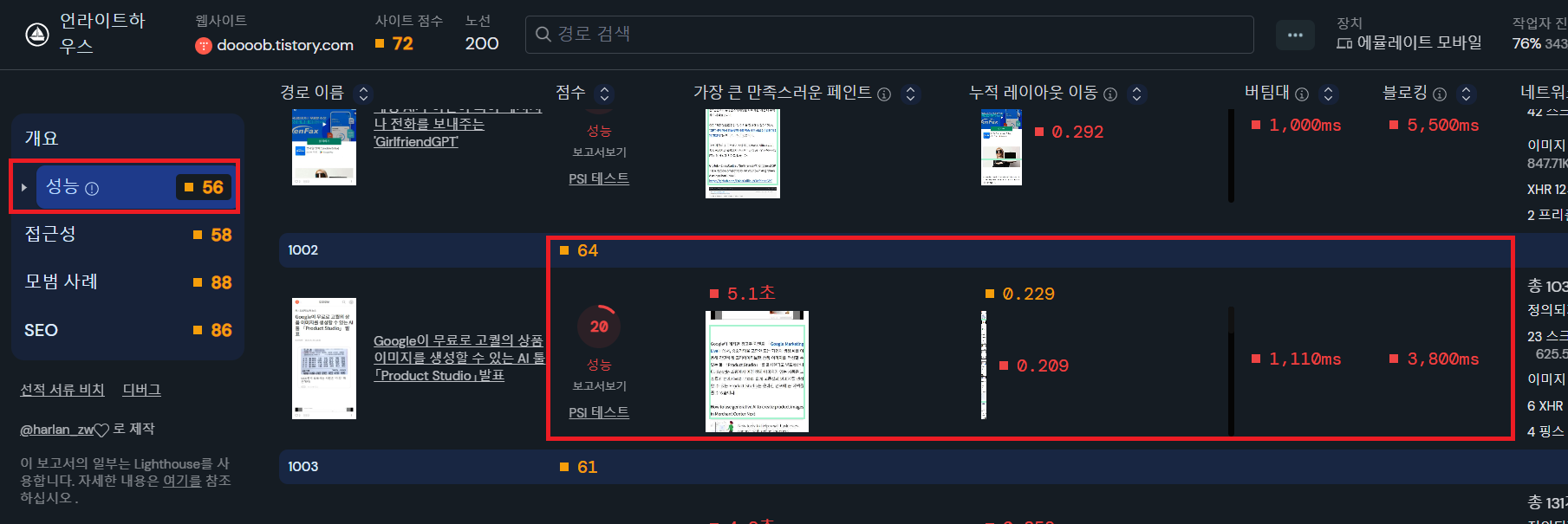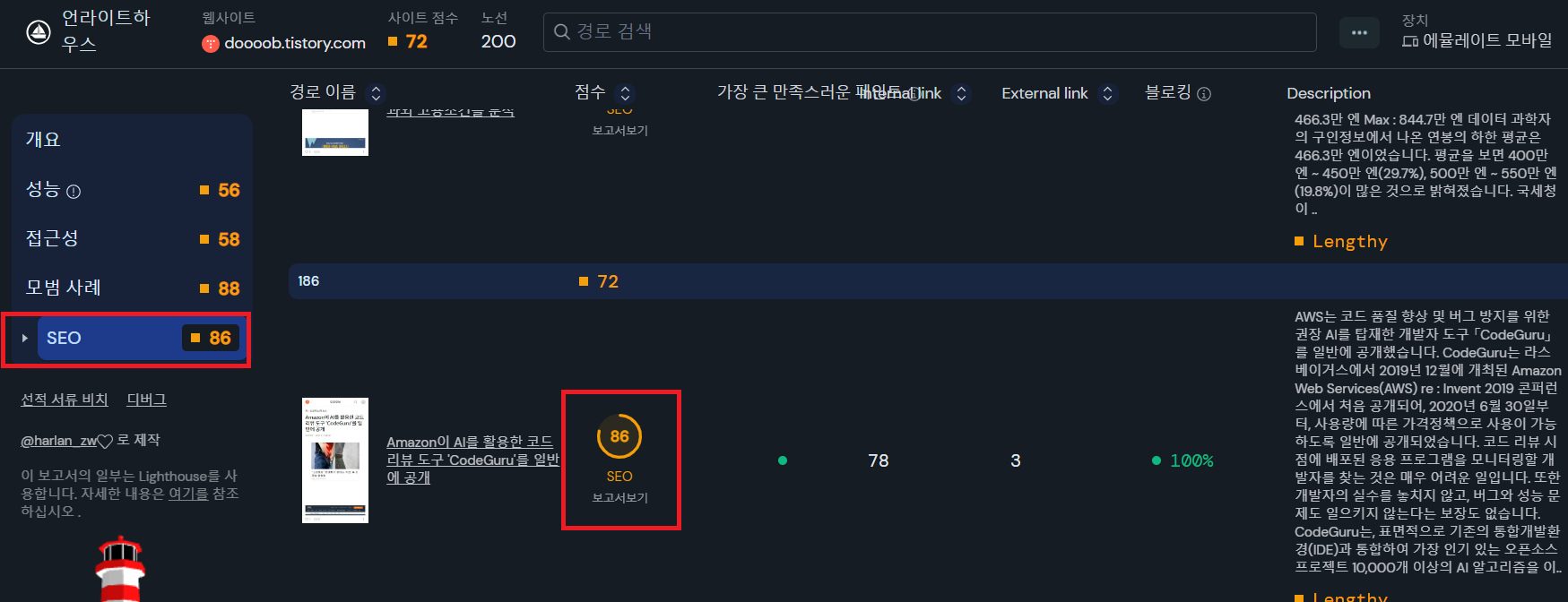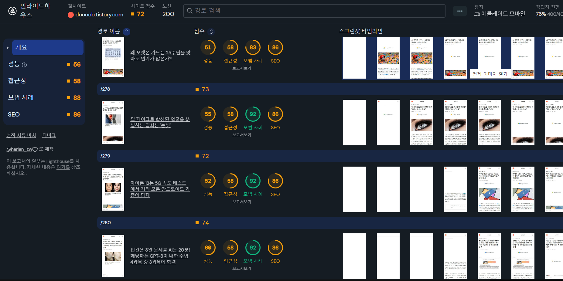 왼쪽 상단에 스캔한 사이트와 전체 점수와 스캔한 페이지 수가 표시되고 오른쪽 상단에는 스캔한 모드가 표시됩니다. 그리고 아래에 스캔한 페이지와 그 결과가 나란히 나옵니다. 또한 스캔 모드는 "Emulated Mobile"로 고정되어 있습니다.