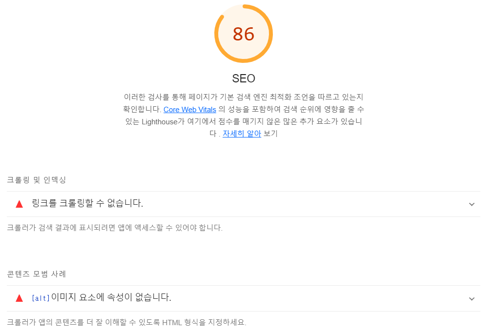 「SEO」 탭에서는 인덱스 가능한 페이지인지 여부, 내부・외부 링크의 수, 탭하기에 충분한 크기의 오브젝트 비율인지 등을 체크 가능합니다.