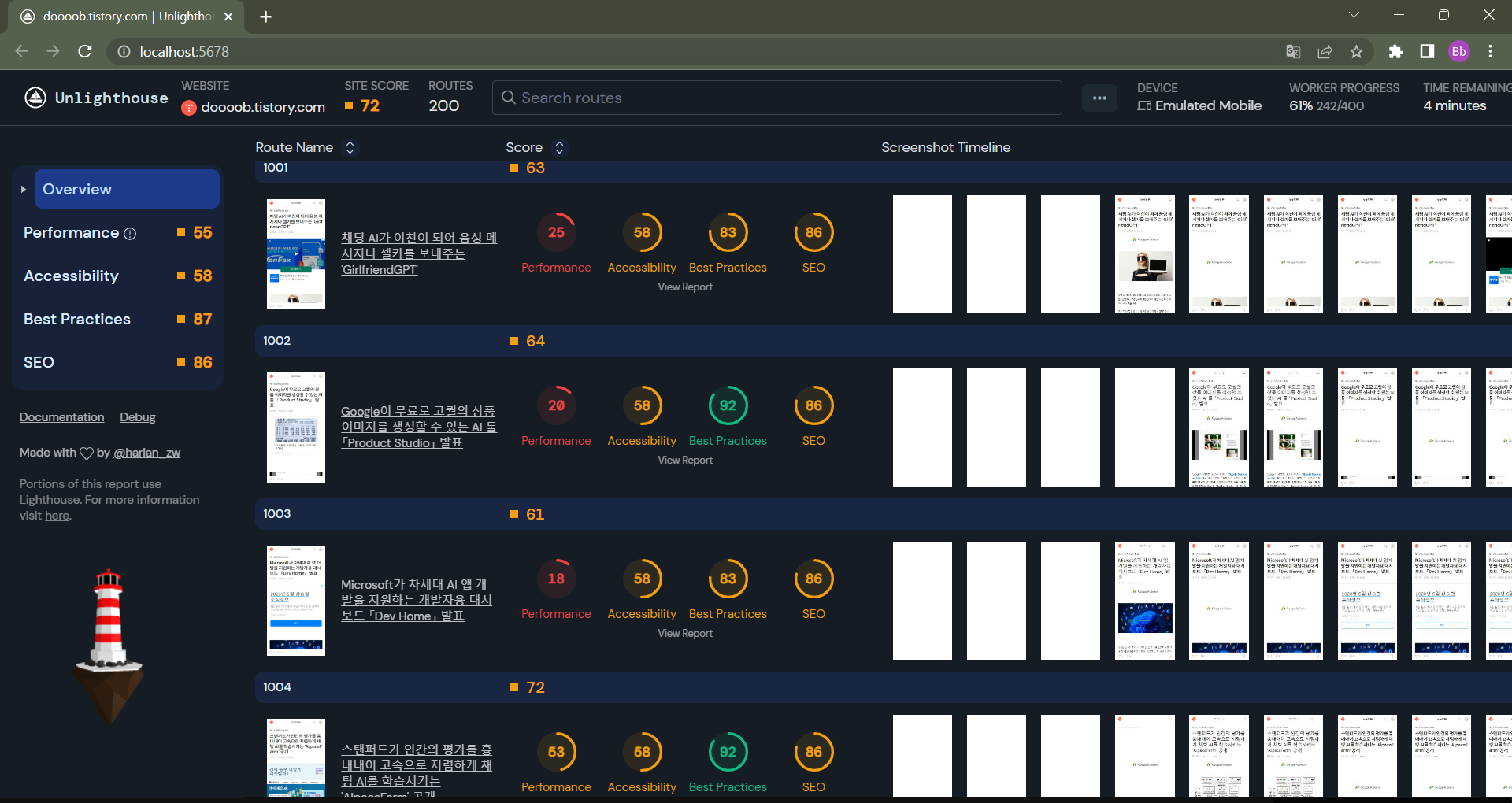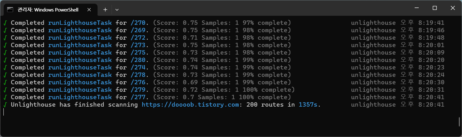 브라우저에서 Unlighthouse 화면이 표시되고 스캔이 시작됩니다. 사이트의 모든 페이지를 스캔하면 좋겠지만, 비슷한 페이지는 샘플링되고 있습니다. 제 블로그, 게시글 약 1천 건 분량을 22분 만에 스캔 완료했습니다.