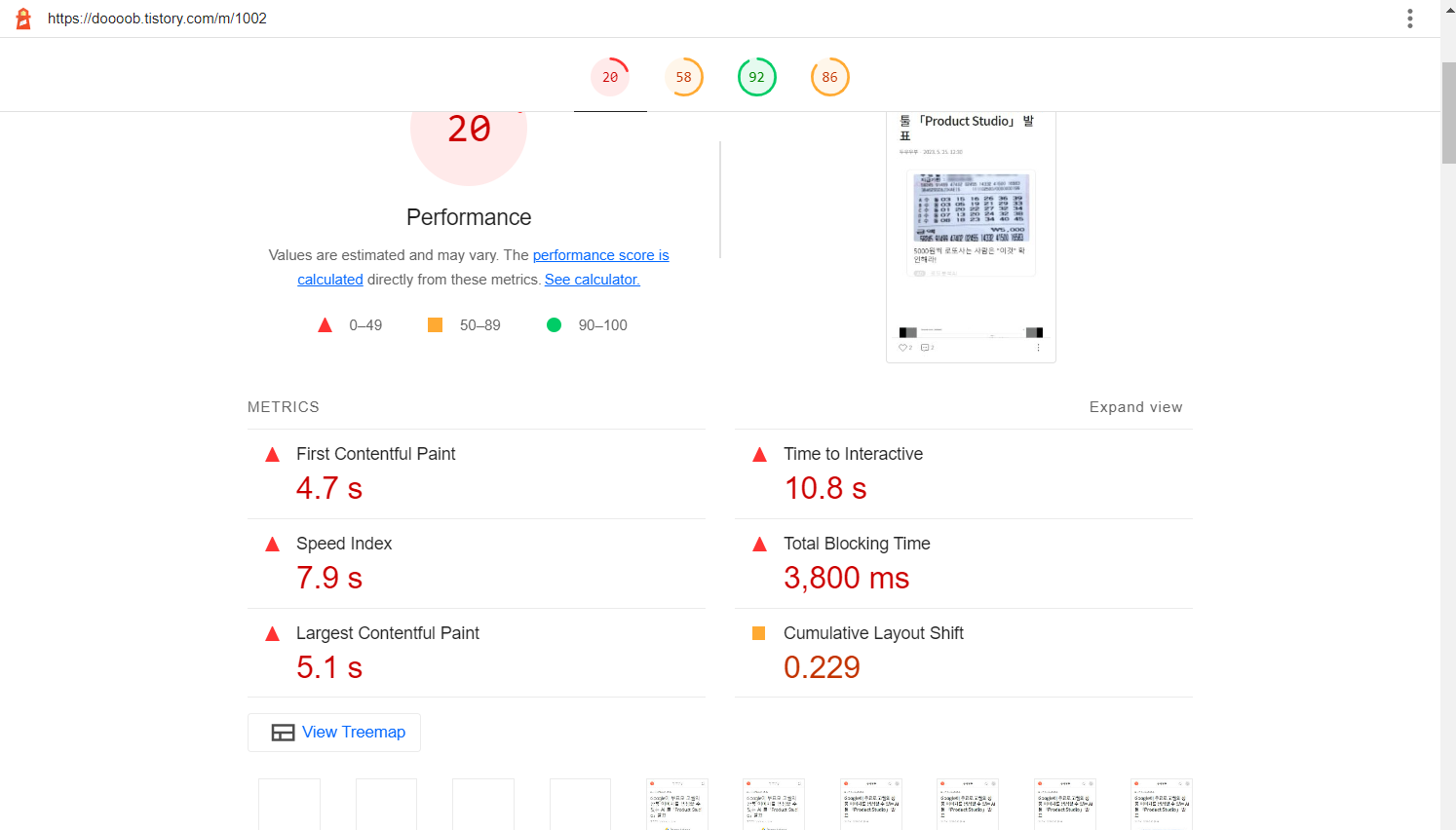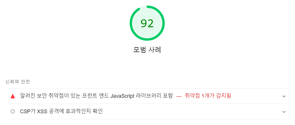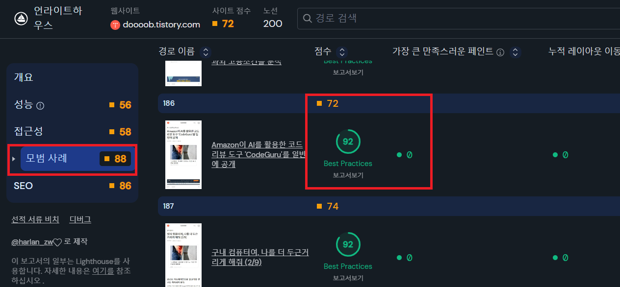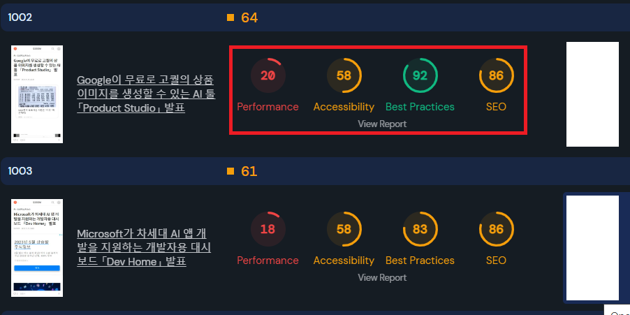 그러자 Lighthouse 크롬 플러그인의 결과 화면이 표시되었습니다. 한 페이지의 결과를 자세히 보고 싶다면, 이 화면을 각각 눌러 보시면 좋을 것 같습니다. 닫기 버튼이 없지만 화면 외부를 클릭하면 닫을 수 있습니다.