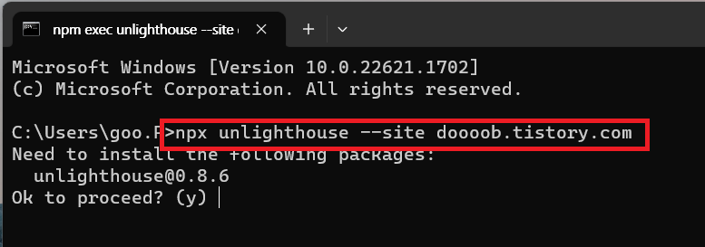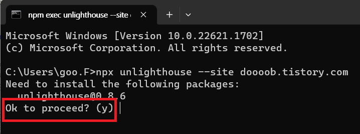 Unlighthouse 패키지를 설치할지 묻는 메시지가 표시되면 Enter 키를 눌러 설치합니다.