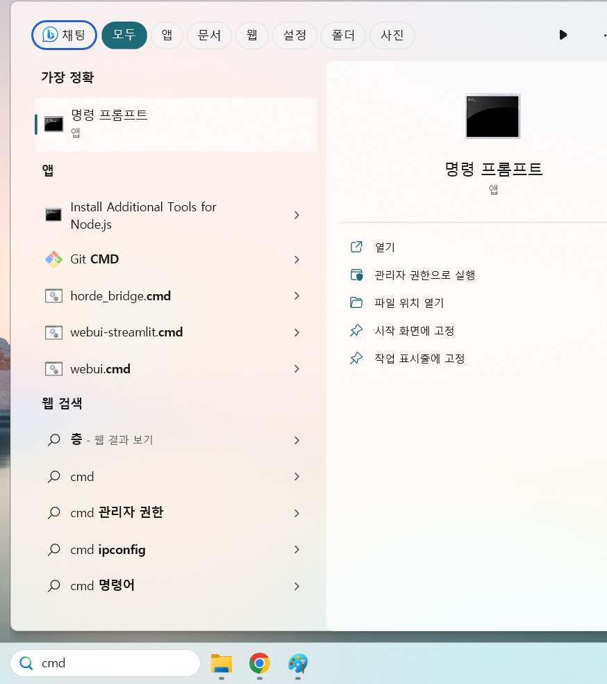 명령줄(Window키 + R키)에 cmd 를 입력하여 명령 프롬프트를 실행합니다.