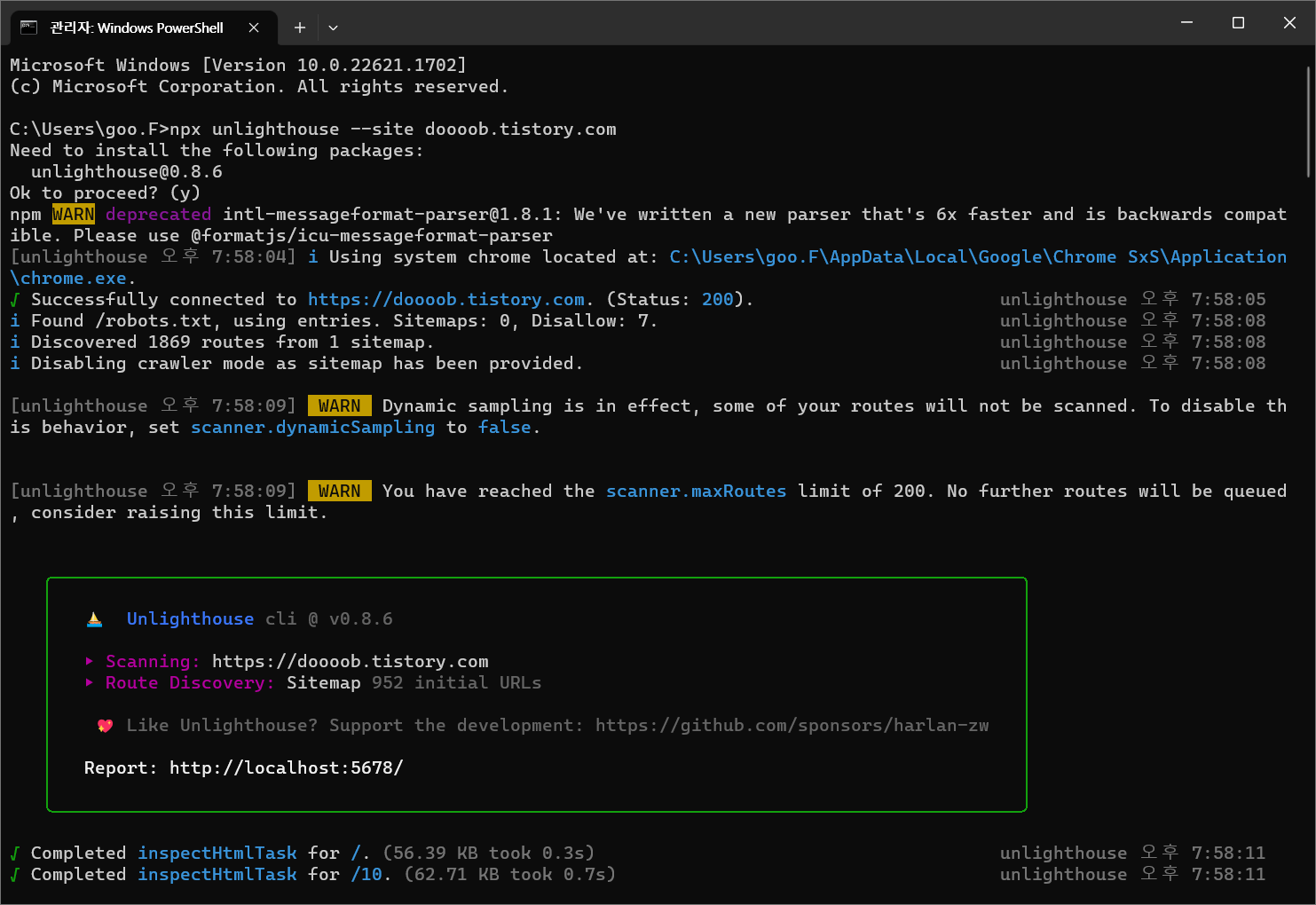 명령 프롬프트가 실행되면, 아래의 간단한 명령줄 입력 하나로 Unlighthouse 실행은 끝입니다.