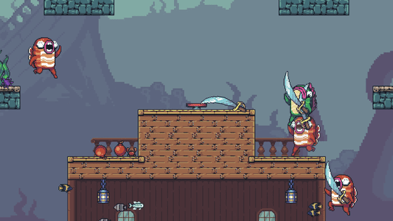 그러나, 발사 레이트도 탄속도 느린 총은 미친 듯이 칼을 휘두르는 물고기에게 속절없이 당하고 맙니다.