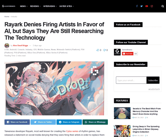 「Cytus」,「DEEMO」등의 개발로 알려진 대만의 게임메이커・Rayark에 대해, 「AI 기술을 도입해, 상당수의 아티스트를 해고하고 있다」라는 루머가 퍼지게 되었고, Rayark는 이에 대하여 거짓 소문이라고 공식적으로 부정 성명을 발표했습니다.