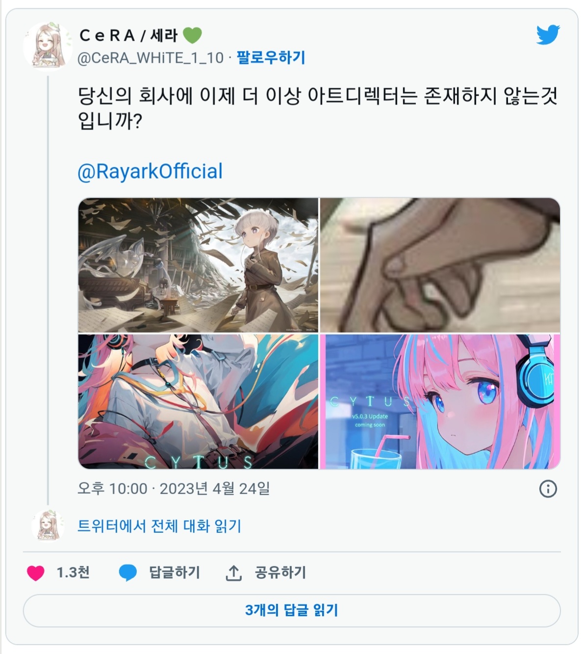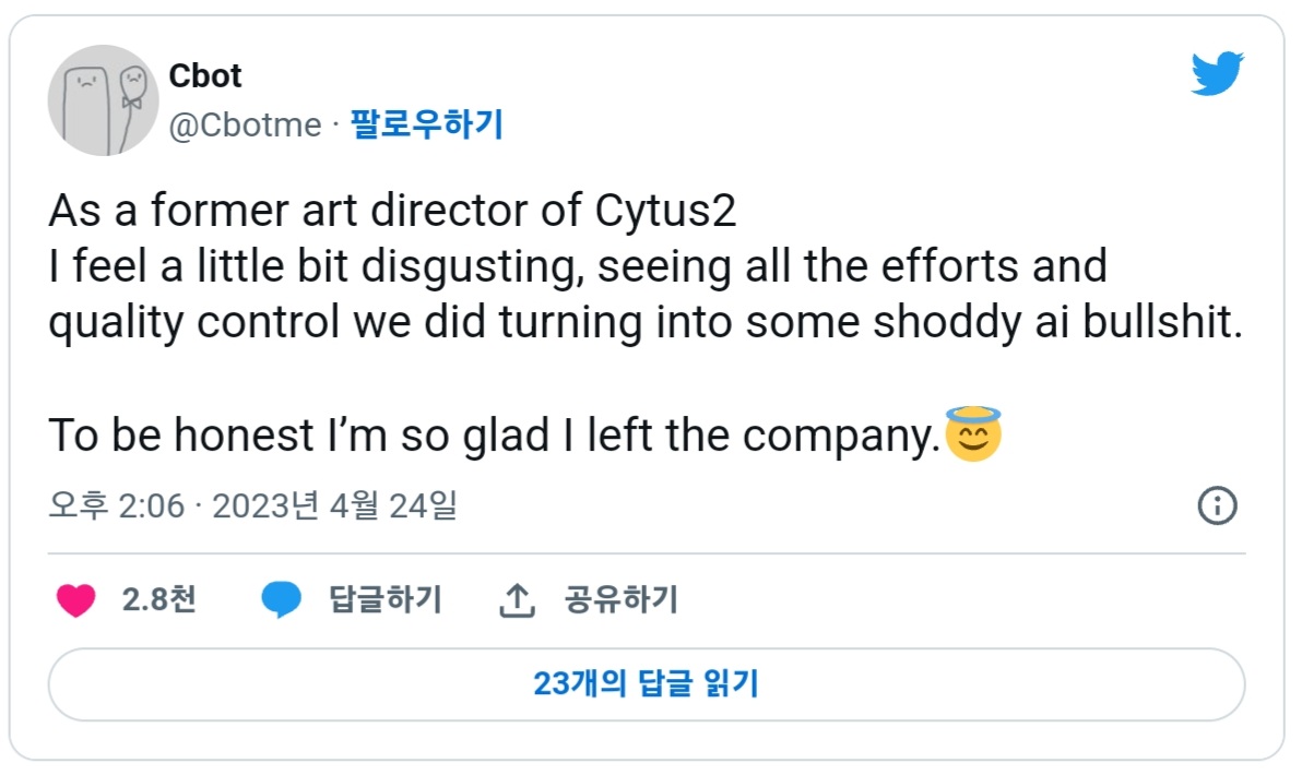 또한 Rayark가 개발하는 리듬 게임 'Cytus2'의 전 디렉터 Cbot(@Cbotme) 씨는 '우리의 노력과 품질 관리가 모두 AI로 만들어진 것이라는 말을 들으면 기분이 나쁩니다. 솔직히 회사를 그만두는 것이 좋았습니다."라고 트윗.