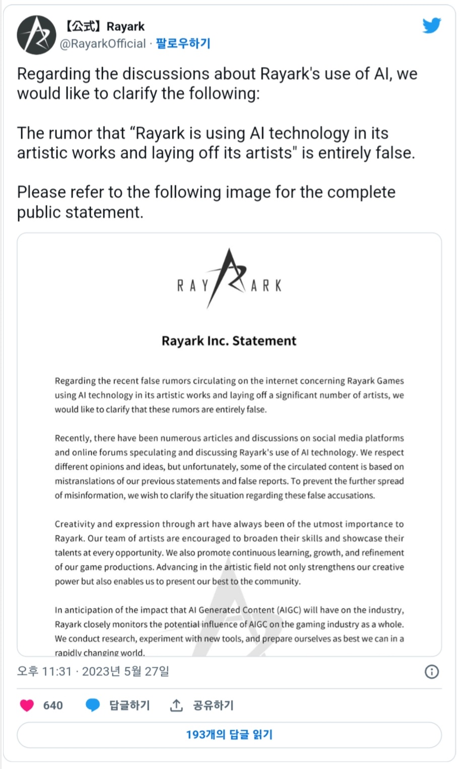 이러한 트윗을 받고 Rayark는 "미술 작품에 AI 기술을 이용해, 미술 스탭을 해고했다는 거짓 정보가 확산되고 있습니다만, 이것은 사실이 아닙니다."라는 성명을 발표했습니다.