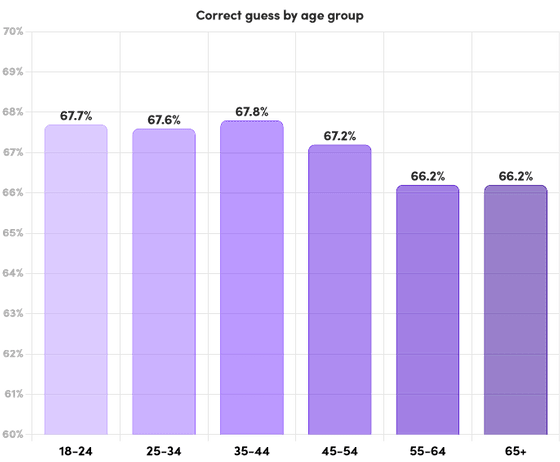 연령별 정답률의 차이는 18세부터 24세, 25세에서 34세, 35세에서 44세까지의 그룹의 정답률이 약간 높고, 나이가 들수록 정답률이 떨어지는 것으로 판명되었습니다.