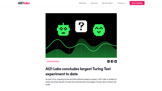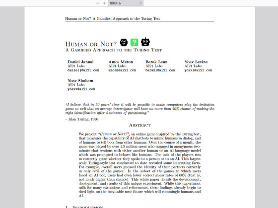 이스라엘에 본사를 둔 AI 시스템 개발 기업인 AI21 Labs가 2023년 4월 중순부터 실시하고 있는 튜링 테스트 「Human or Not?」은 참가자가 2분간에 걸쳐 AI 또는 매칭된 인간과 채팅을 하고, 상대가 AI인지 인간인지를 추측합니다. 실험 결과, 약 68%의 참가자가 AI와 인간을 올바르게 판별할 수 있었다고 합니다.