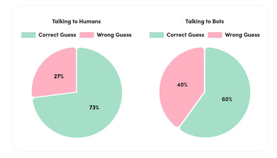AI21 Labs가 200만 건에 걸친 대화와 답변을 분석한 결과, 약 68%의 참가자가 대화 상대가 AI인지 인간인지를 정확하게 판단할 수 있었습니다. 또한, 인간끼리의 대화에서는 약 73%의 정답률이 기록되었지만, 인간과 AI가 대화를 할 때의 정답률은 약 60%에 그쳤다고 보고하고 있습니다.