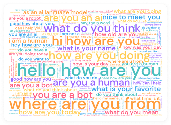 AI21 Labs는 "Human or Not?"내에서 사용된 인기 있는 메시지를 소개하고 있습니다. 많은 사용자가 'Hello', 'How are you', 'Where are you from' 등 상대방의 상태를 묻는 질문을 던지고 있었다는 것을 확인할 수 있습니다.