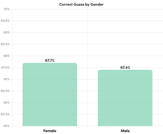 성별에 따른 정답률의 차이는 남성과 여성 모두 큰 차이는 없었지만, 여성이 67.7%였지만, 남성은 67.4%로 여성이 약간 우세했습니다.