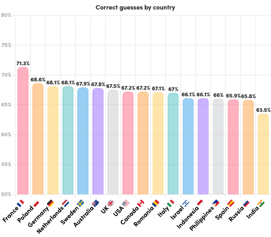 국가별 정답률을 보면 평균 정답률이 68%였는데, 프랑스 참가자는 71.3%의 정답률에 도달한 것으로 밝혀졌습니다. 한편 데이터가 취득된 나라 중 최하위였던 것은 인도로 정답률은 63.5%였습니다.