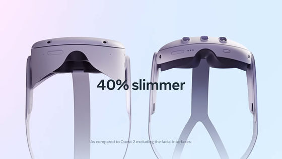 Quest 3는 Quest 2보다 얇은 것이 특징입니다. 예를 들어, Quest 2에서는 프레넬 렌즈(집광용 볼록 렌즈)가 사용되고 있었던 것에 비해, Quest 3에서는 Quest Pro와 마찬가지로 팬케이크형 렌즈를 채용. 이것에 의해, 광학 부분이 Quest 2보다 40% 슬림해졌다고 합니다. 실제로 Quest 2(왼쪽)와 Quest 3(오른쪽)으로 바이저 부분을 늘어놓으면 이런 느낌.