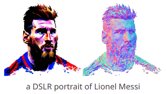 예를 들어 "SLR로 촬영한 리오넬 메시의 초상화"라는 프롬프트를 입력하여 생성한 3D 모델이 아래입니다. 이미지를 클릭하면 3D 모델이 360도 회전하는 애니메이션을 볼 수 있습니다.