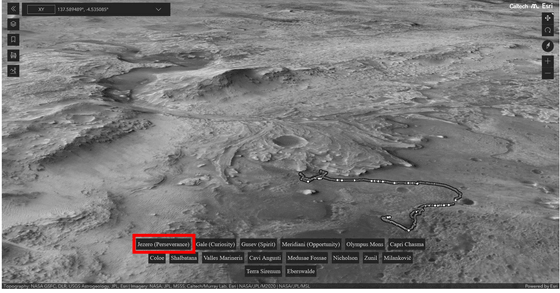 예를 들어, Jezero(Perseverance)를 클릭하면 2020년에 발사된 화성 탐사기 퍼서비어런스가 착지한 Jezero 분화구가 표시됩니다. 분화구에는 퍼서비어런스의 이동 경로도 표시되었습니다.