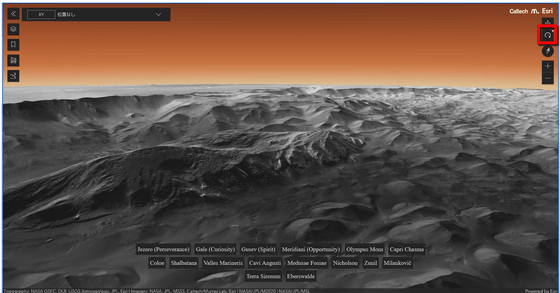 오른쪽 상단에서 두 번째 아이콘을 클릭하면 카메라 방향을 변경할 수 있습니다. 카메라로 찍는 각도를 낮추어 보면 화성 표면의 지형이 울퉁불퉁하다는 것을 잘 알 수 있습니다.