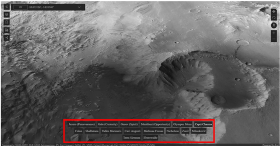 아래에 표시된 버튼은 화성의 유명한 장소로 이동할 수 있는 버튼입니다.