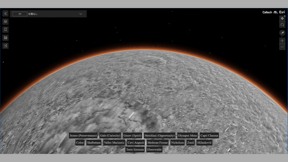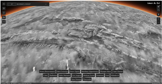 화성 정찰위성(MRO)은 NASA가 개발한 화성 탐사기로 2005년에 발사되어 2006년부터 화성의 과학 관측을 계속하고 있습니다. 캘리포니아 공과대학의 블루스 머레이 행성 영상화 연구실이 이 MRO가 촬영한 총 5.7 테라픽셀의 사진을 사용해 화성 표면을 볼 수 있는 3D뷰어 「The Global CTX Mosaic of Mars」를 공개습니다.