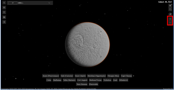 오른쪽에 있는 「+/-」로 줌 인아웃이 가능. 다음은 화성 전체가 비칠 때까지 축소한 것.