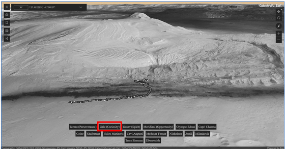 「Gale(Curiosity)」를 클릭하면, 2011년에 발사된 화성 탐사기・큐리오 시티(로버)의 착지점인 게일 크레이터와, 큐리오 시티의 이동 경로가 표시됩니다.
