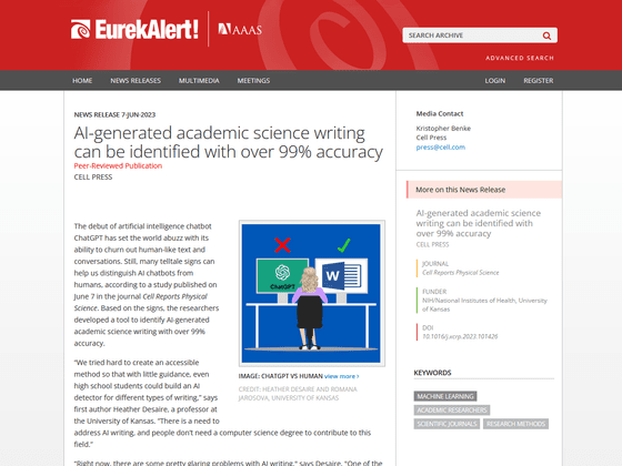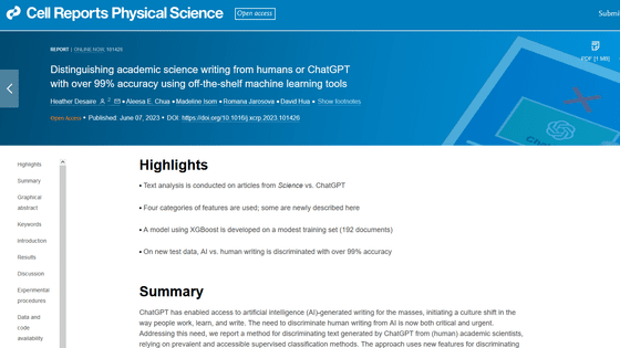연구팀에 의하면, 인간이 쓴 논문인지 ChatGPT가 생성한 논문인지를 판단하는 데 있어서 기준이 되는 것은, 인간과 ChatGPT의 문장의 사이에 있는 「문체의 차이」라고 합니다. 논문을 발표하는 과학자들은 ChatGPT보다 전문적인 단어나 문구를 알고 있는 경우가 많고, 다양한 단어를 포함한 긴 단락을 쓸 가능성이 있다고 합니다. 또한, 인간이 쓴 논문에는 ChatGPT에 의해 생성된 문장에 별로 포함되지 않는, 물음표나 괄호, 세미콜론 등이 많이 포함되어 있다는 것입니다.