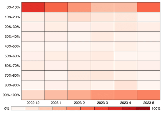 AI 생성 이미지를 업로드하는 사람의 'AI 의존도'는 크게 양분되어 있습니다. 다음은 월에 하나는 AI 생성 이미지를 업로드하는 사람을 대상으로 그 달에 업로드한 모든 이미지에 대한 AI 생성 이미지의 비율을 색으로 구분한 것입니다. Adobe Stock에 AI로 생성한 이미지를 업로드하는 사람은 조금 AI를 만져본 사람(0~10%) 또는 AI 생성 이미지 제작에 전념하는 사람(90~100%) 중 하나입니다. 따라서, 그 중간은 거의 없다는 것을 알 수 있습니다.