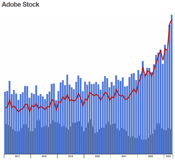 이전 두 회사와 달리 Adobe Stock의 수입은 2022년부터 분명히 급증하고 있습니다. Adobe Stock은 2022년 12월에 AI가 생성한 스톡 사진 처리를 공식적으로 시작했으며 이로 인해 판매 증가에 약간의 영향을 미칠 가능성을 부정할 수 없습니다. 그러나, 증가분인 AI 매출은 극히 일부에 지나지 않을 것이라고 큐델씨는 예상하고 있습니다.
