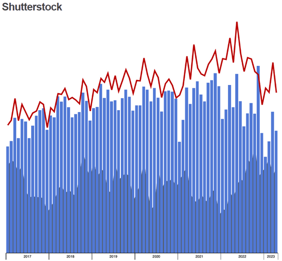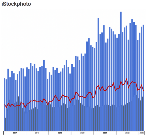 아래는 iStockphoto의 수익 추이를 나타내는 그래프로, 파란색 막대는 수익, 빨간색 꺾은선 차트는 다운로드 횟수, 아래쪽 짙은 색은 업로드 수를 나타냅니다. iStockphoto는 2017년 이후 꾸준히 수익을 늘리고 있으며, 2020년과 2021년에 신형 코로나바이러스 감염이 맹위를 떨치면서 수익은 더욱 가속화되었습니다. 강력한 이미지 생성 AI가 잇달아 등장하기 시작한 2022년 후반 이후에도 수익은 안정되어 있어, 크게 감소하는 모습은 보이지 않습니다.