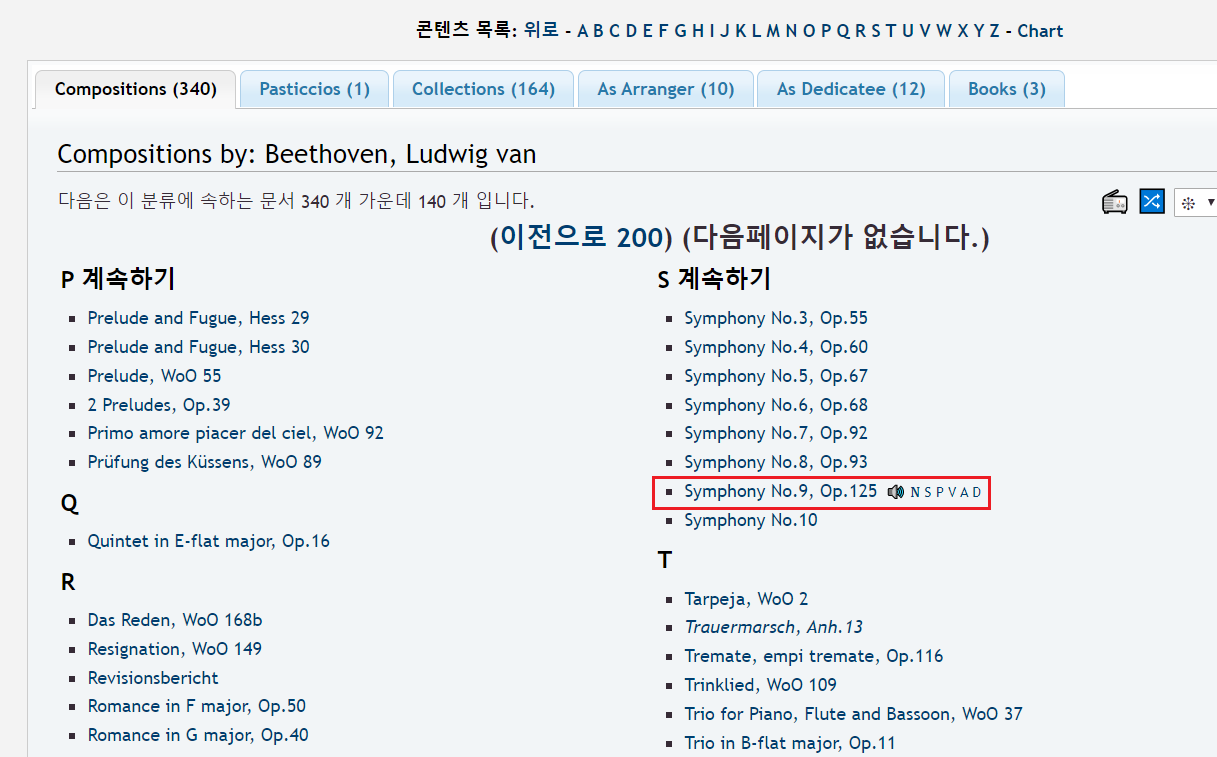 알파벳 인덱스에서 B를 선택하고, 작곡자 이름의 목록이 표시되면 베토벤을 눌러봅니다.