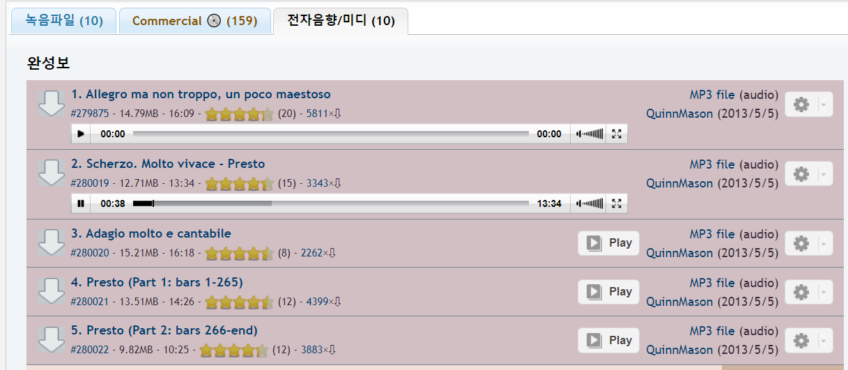곡의 다양한 음원을 들을 수 있는 페이지가 열립니다. 음악을 들으려면 "Play"를 클릭.