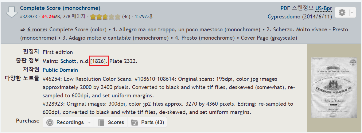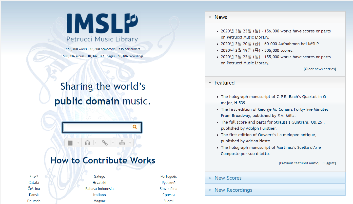 IMSLP의 홈페이지는 이런 느낌입니다. 한국어도 제공하고 있습니다.
