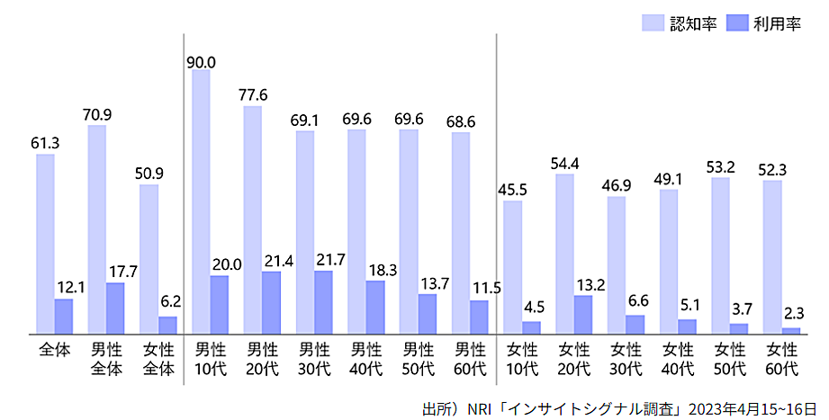 노무라 종합 연구소는 2023년 4월 15~16일 간토 지방에 사는 15~69세를 대상으로 인터넷 설문 조사를 실시하여 ChatGPT의 인지도와 이용 상황을 밝혔습니다.