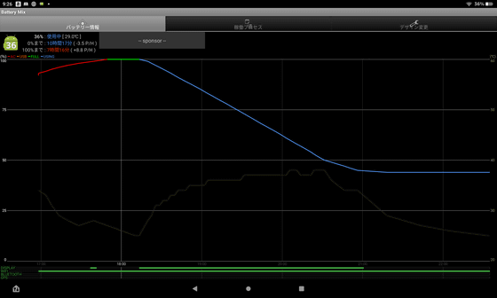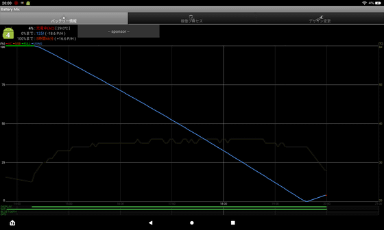 그러나 처음에는 약 3 시간 만에 YouTube 앱이 종료되었습니다. 배터리 상태를 감시하는 앱 「Battery Mix」로 감시하고 있었습니다만, 방금 배터리 온도가 약 35도 정도까지 올라간 타이밍에 앱이 꺼진 것 같고, 배터리 잔량(파랑)은 평평해진 시점에서 43%가 되었습니다.