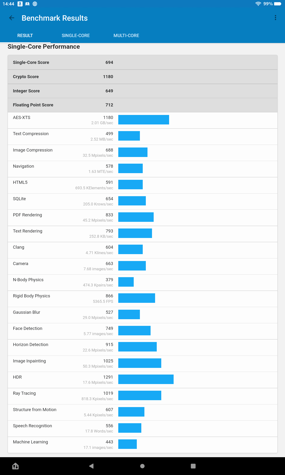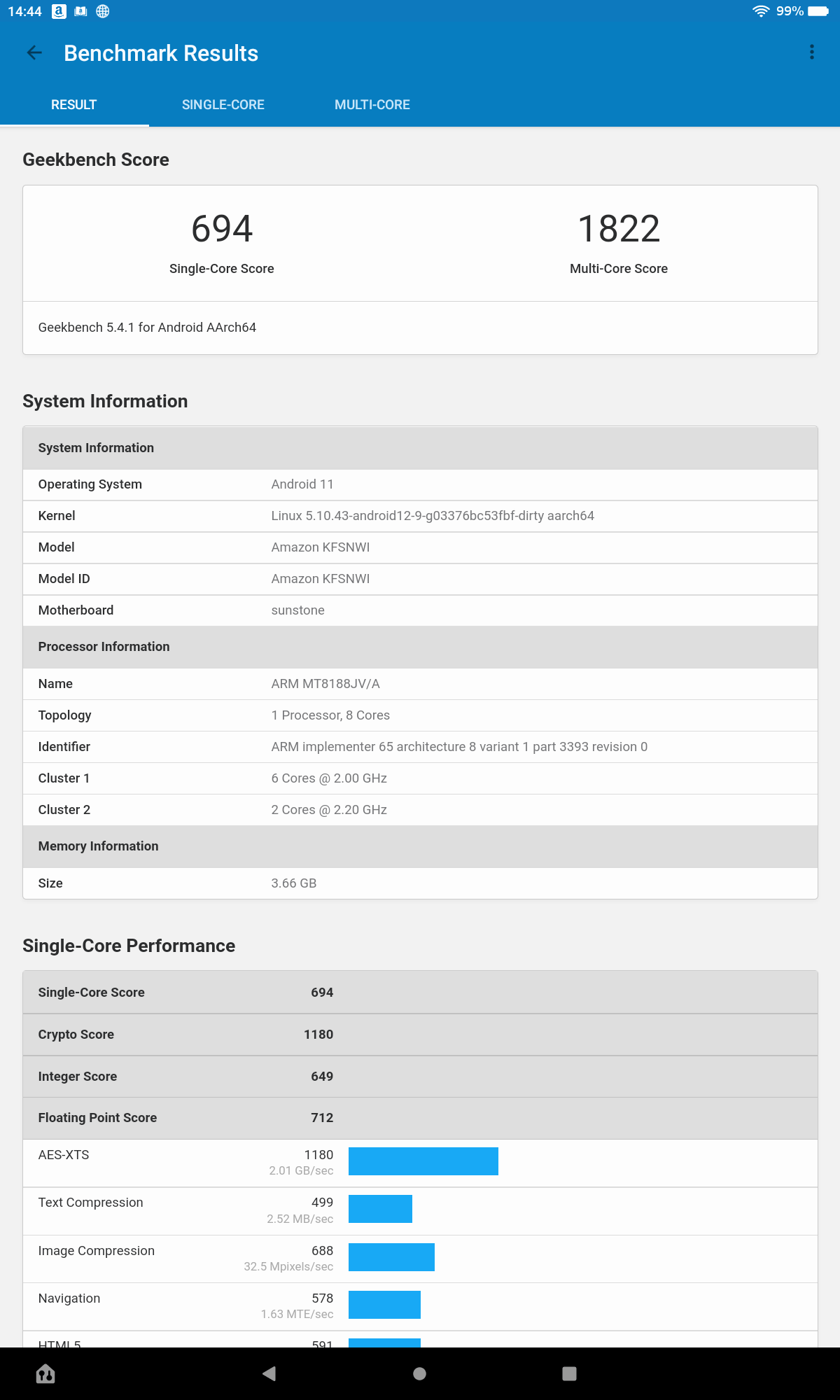 Fire Max 11에서 벤치마크 앱 "Geekbench 5"를 돌려 보았습니다.