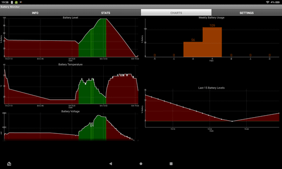 다른 배터리 감시 앱 「Batteri Monitor」로 감시한 결과가 아래. 배터리 온도(Battery Temperature)는 대체로 35도로, 조금 넘는 정도였습니다.