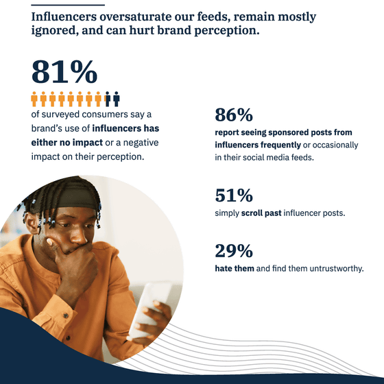 Entribe의 조사에 따르면, 조사 대상이 된 소비자 중 81%는 브랜드가 인플루언서를 기용해도 구매 행동에 변화가 없거나 오히려 부정적인 효과를 받는다고 응답했습니다. 인플루언서의 투고 자체는 86%의 소비자가 열람하고는 있습니다만, 51%는 그냥 스크롤해서 넘기고 있으며, 29%는 오히려 혐오감을 나타내며 신뢰할 수 없다고 생각했습니다.