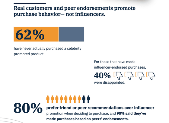 62%는 유명인이 프로모션을 담당하는 상품을 구입한 적이 없었고, '인플루언서에게 수익이 제공되는' 상품을 구입한 사람의 40%가 기대 이하였다고 응답했습니다.